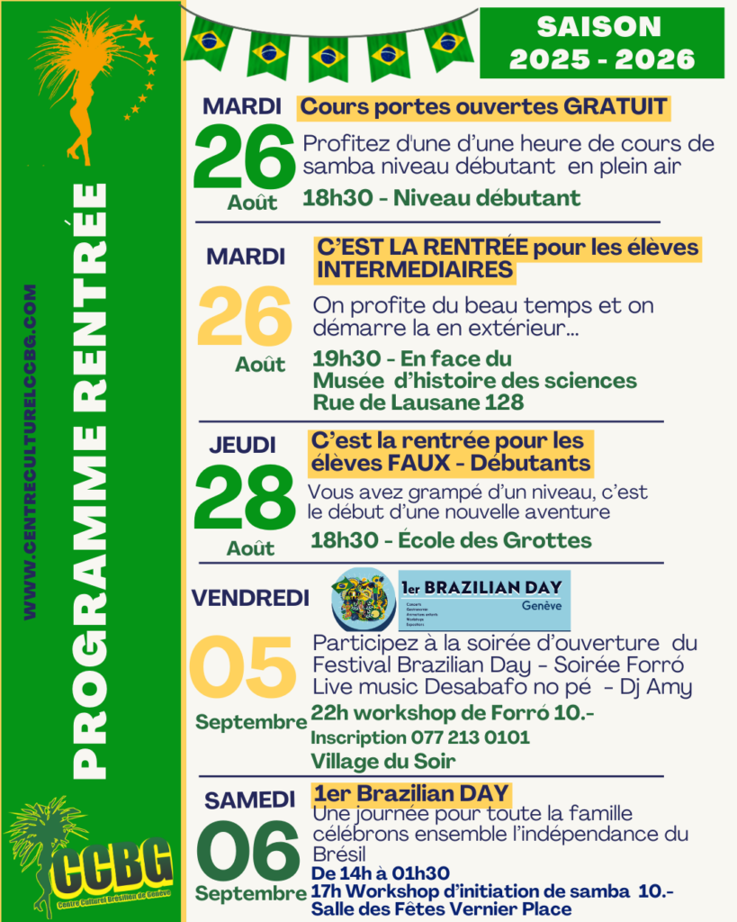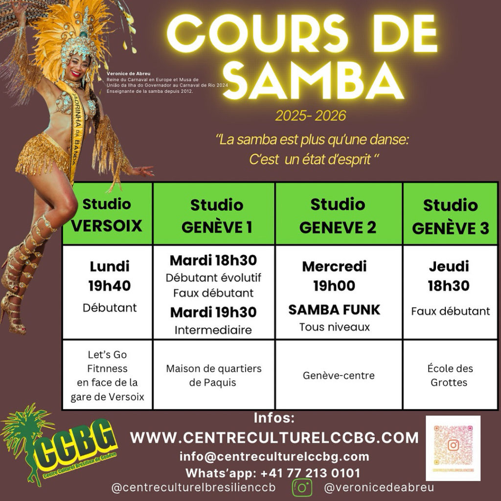 Des cours de Samba réguliers sont proposés toutes les semaines ainsi que nombreux événements bien notamment la co-production du Carnaval de Rio à Genève.